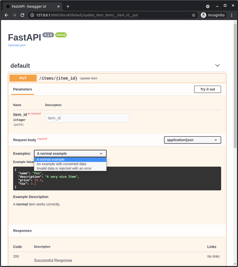 Um dieses Problem zu lösen, hat FastAPI 0.103.0 Unterstützung für die Deklaration desselben alten OpenAPI-spezifischen examples-Felds mit dem neuen Parameter openapi_examples hinzugefügt. 🤓